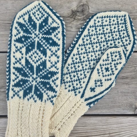 Hjemmestrikkede selbuvotter i damestørrelse til salgs. Vottene er strikket i blå og ubleket hvit 3-tråds strikkegarn fra Rauma garn. Vottene er ubrukt. Røyk- og dyrefritt hjem.
