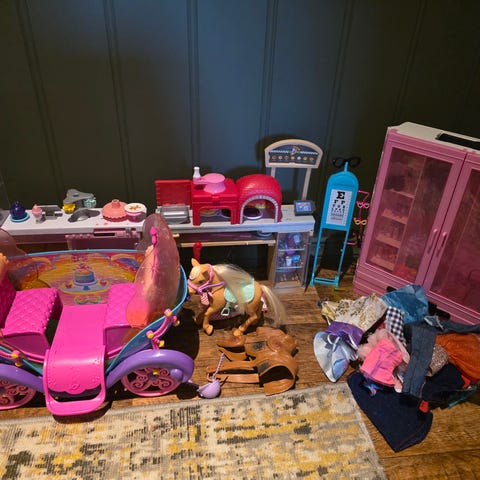 Masse Barbie og Ken dukker og noen andre dukker, klær tilbehør og hester.