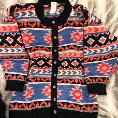 Varmt og godt håndstrikket sjal i blått/grønt ullgarn.