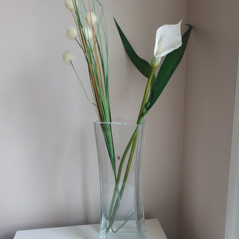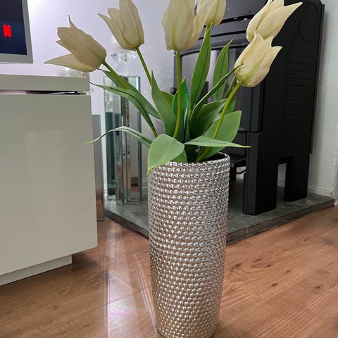 Blå vase/tulipanvase i glass. Høyde: 19cm, diameter: 17.5cm.