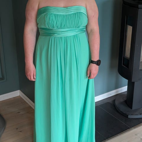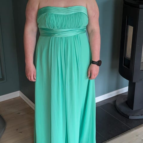 Lang selskapskjole i ein fin mørk turkis/grønnblå farge, av merket Donna morgan. Stroppeløs og elegant. Det var vanskeleg å fange fargen med mobilkameraet, men på bilde nr 2 kjem fargen ganske godt fram:)