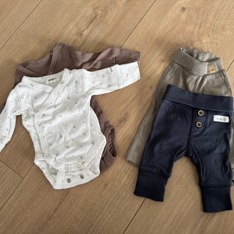 Selger en liten klespakke i str 44 brukt av tvillinger. Klærne er brukt en kort periode, men er super praktisk da de kan forlenges og brukes fra str 44 og ut str 50. Det er ingen flekker eller andre bruksmerker.
