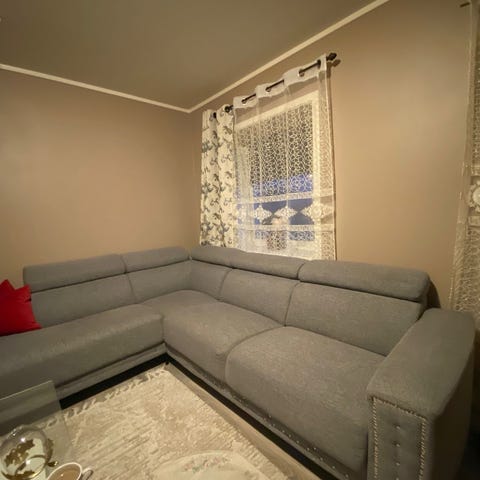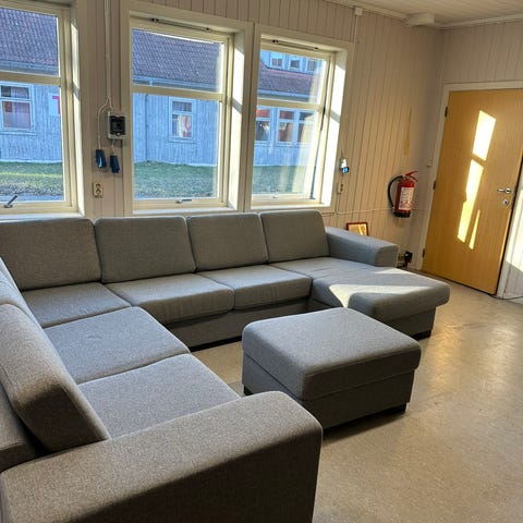 Sofaen er i grå velour og lite brukt, da den står på hytta.