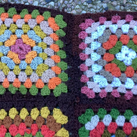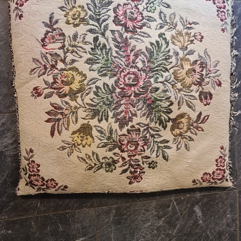 Gammel regnbuemønstret pute. Har selv plukket den med meg fra en brukthall, så vet ingenting om alder eller hvor den kommer fra.