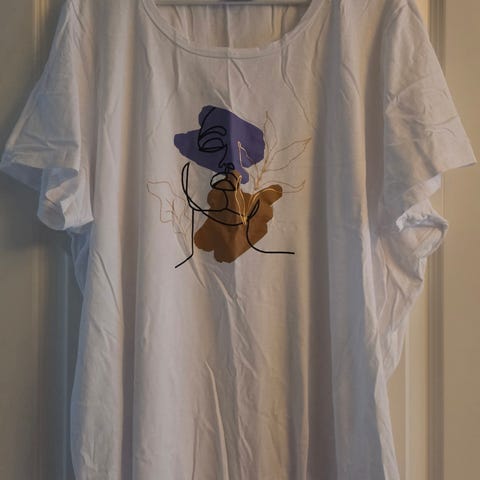 T-skjorta er kjøpt uten tag - men ble angitt som one size (str L). Stoffet kjennes ut som en blanding av bomull og polyester - med god stretch.