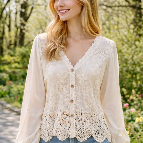 Beige topp med mørkerødt og blått trykk, knapp i nakken