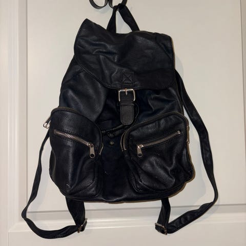 Flott svart ryggsekk med en blank finish. Sekken har et tidløst design med to frontlommer, samt en praktisk glidelåslomme på fronten. Perfekt for hverdagsbruk, enten til skole, jobb, eller en dag på byen. Ryggsekken har justerbare stropper for komfort, og den romslige innvendige plassen gjør det enkelt å organisere alt du trenger. Jeg er usikker på om den er laget av ekte skinn, og derfor har jeg satt en lavere pris. Se bilder for mål.