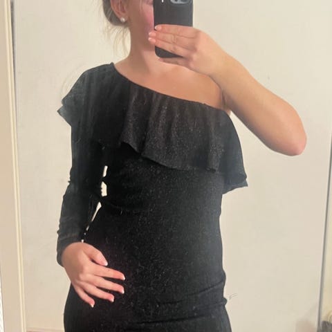 Svart one-shoulder kjole i mykt behagelig stoff. Kjolen har en skulderstropp og delvis skrå hals. Tettsittende passform. Kun brukt ett par ganger, fremstår som ny. Str. S.