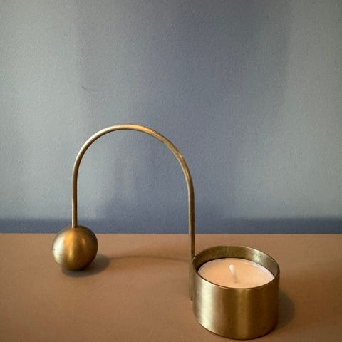 De geometriske formene er både skulpturelle og funksjonelle elementer, da buen kan brukes som et håndtak for å bære lysestaken.