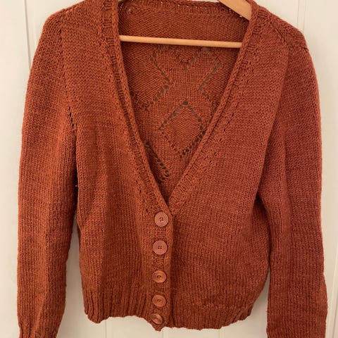 Nydelig håndstrikket Dahliajakke. Strikket i mykt ullgarn som kan vaskes på ullprogram.