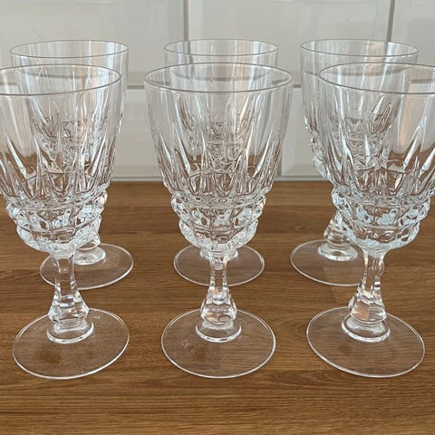 6 stk Pompadour vinglass i krystall. Fin til dessertvin. Høyde: 13,5cm. Fremstår som ny.