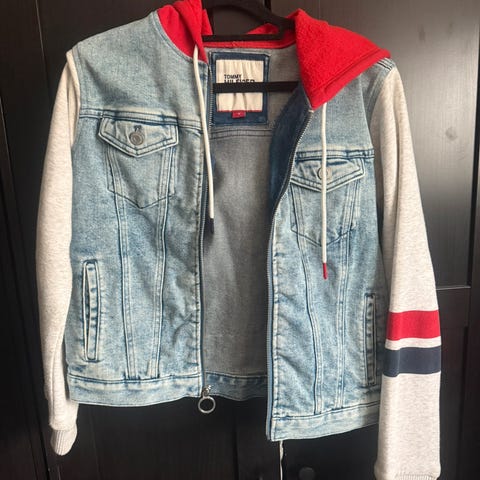 Hvit denimjakke fra Tommy Hilfiger. Størrelse 10, men liten i størrelsen, så tilsvarer en S-M. Masse stretch så er veldig komfortabel på. Kjøpt for over 2000kr.