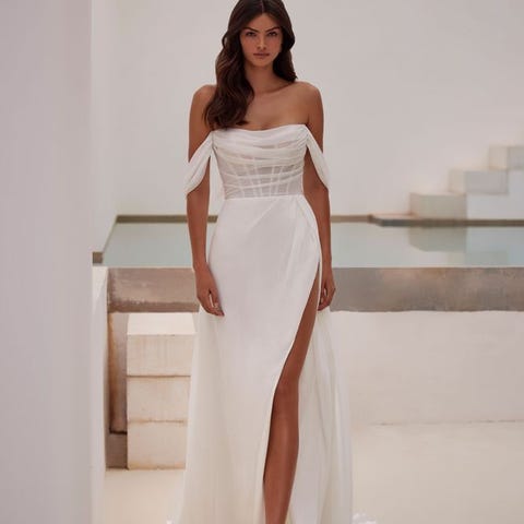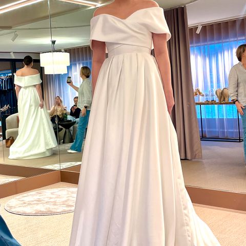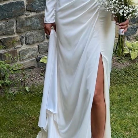 Med tungt hjerte selger jeg verdens fineste brudekjole (helt objektivt sett, såklart). Denne kjolen er litt av alt; søt, klassisk, enkel, litt edgy og morsom. Den er brukt én gang, og nyrenset så den er så god som ny🤍 Kjøpt på Anna Johnson for 21.000kr. Originalt har denne kjolen lukking i rygg med bånd, men har sydd den om til å ha glidelås og nydelige, små knapper, kan ses på bilde 2. Den er også svært flatterende og praktisk, og legger seg veldig fint! Trenger ikke puffes og ordnes med av forlovere til enhver tid. Splitten er høy, men ingen fare for upassende oppførsel 🤭 Overdelen er et korsett, som gir kjolen et eget preg. Kjolen kan prøves i Oslo, og pris kan diskuteres ved behov.