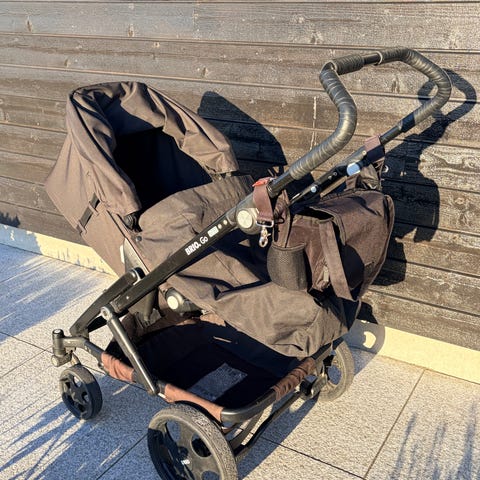 Vogna er sjølv kjøpt brukt, og godt brukt av førre eigar som var veldig fornøgd! Har sjølv ikkje brukt den og selge vidare då eg har andre vogner. Regntrekk til liggende og sittedelen følgjer med.
