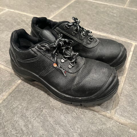 Skoene er brukt ca 5 ganger innendørs i forbindelse med kjemilab, De er nesten som nye med unntak av en liten slitasje på venstre sko (se bilde).