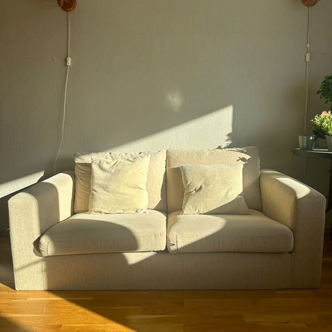 Brukt sofa med vendbare puter.