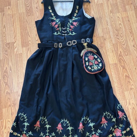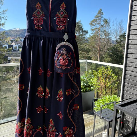 Veske med lås, kyse med bånd og et belte i bunadsstoffet følger med. Bunaden er lagret i stoffpose, som du også får med i handelen.