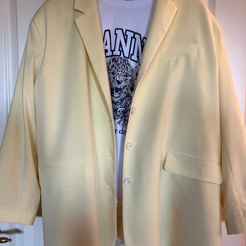 Varm gul vintage blazer med skinnlapper på albuene og flettede skinn knapper på ermene. Jakken er hel og fin uten skader eller mangler. En klassisk stil som aldri går av moten.