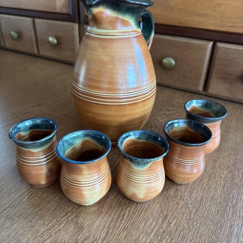 Empoli mugge og 4 glass med rotting. Fra 1960- tallet . Ingen skader, munnblåst, nydelig grønn farge. Gedigent flott og solid. Kan pakkes godt og sendes mot porto.