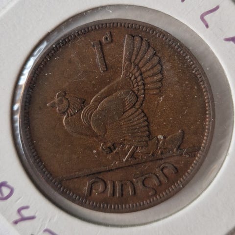 Dette er en irsk mynt, spesifikt en 1 pence mynt fra Republikken Irland. Mynten har et design med en fugl (en hare) på den ene siden og en harpe med ordet “Éireann” (irsk for Irland) på den andre siden.