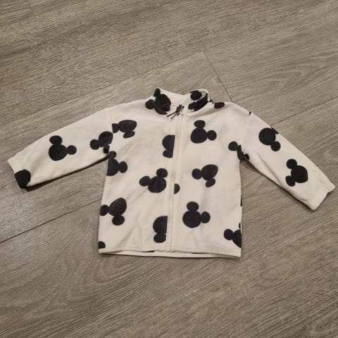 Blå fleecejakke med orange kanter. Det er to lommer med glidelås på sidene og en lomme med glidelås på bryset. Det er «hull» til tommelen på begge armene. Den er i str 6. Nesten ikke brukt