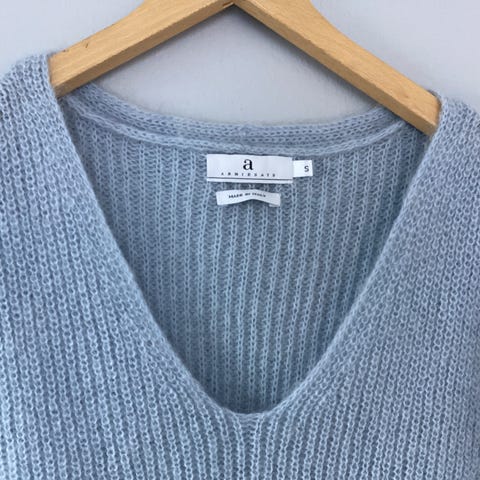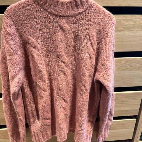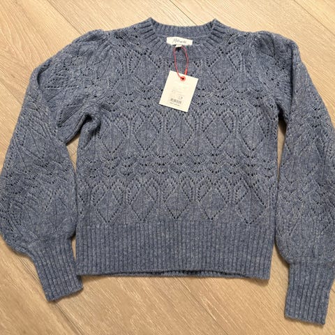 Genser i strikket kvalitet fra Noa Noa. Står XS på lappen, men stor i str så minner mer om en M. Nydelig gråblå farge med sølvpaljetter. Plagget har hengt på henger og maskene på øverste del har derfor strekt seg/blitt større. Laget i en miks av: Mohair, ull, akryl og polyamid.