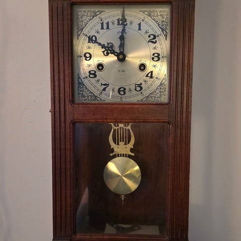 Har pendel og slår hver ett slag ved hver halvtime, samt timens antall ved hver time. Treverket og dekorasjonen er ok, Urverket er funksjonelt. Nøkkel til opptrekk er på plass. Eieren av uret var født i 1865, så trolig er urverket fra slutten av 1800-tallet. Be gjerne om å få se den før du bestemmer deg. Ønsker ikke å sende den. Bør hentes. Video med lyden på slagene kan sendes som sms.