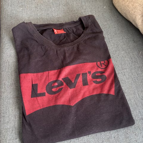 Sort T-skjorte med rødt levistrykk. Står xl på den, men den er mer som en M.