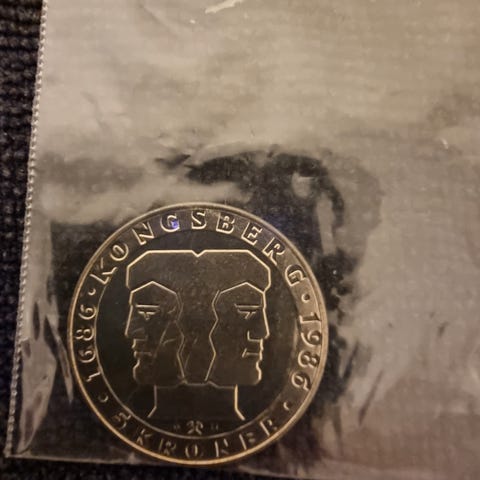 1686 Kongsberg 1986 5 kroner head of the mythical figure Janus. Engraver: Øivind Hansen