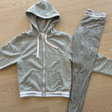 Detaljer: hettejakke med glidelås og A|X-logo, bukse med mansjetter.