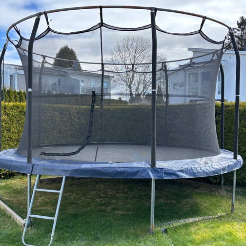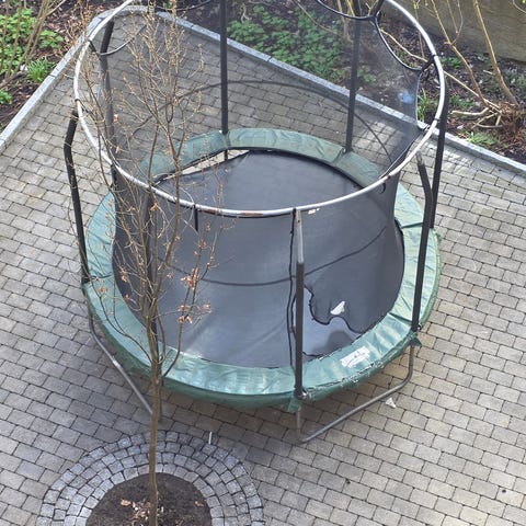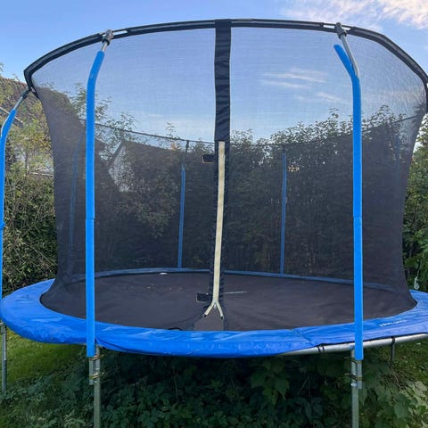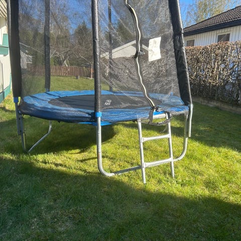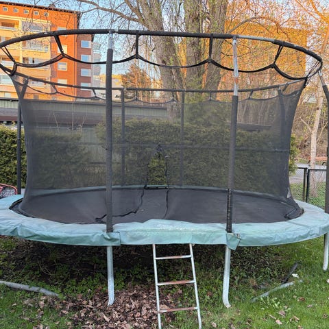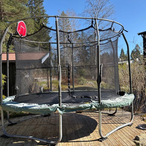 Godt brukt trampoline. Funkar fint, men bør nok få ny polstring på metallstengene og nytt nett. Må demonterast ved henting. Meir info: https://jumpking.no/product/31x46-oval-combo-trampoline/