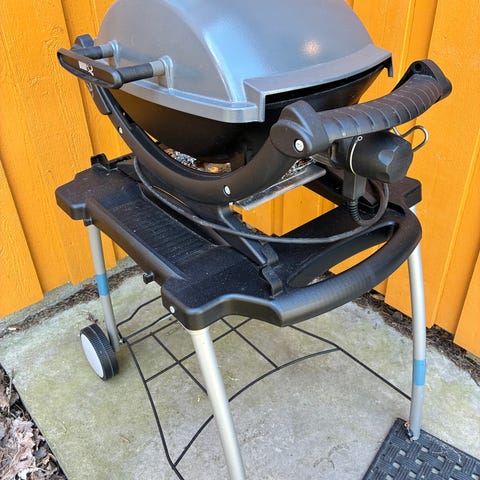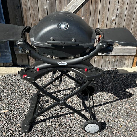 Velholdt Weber Q200 gassgrill med stativ og trekk.