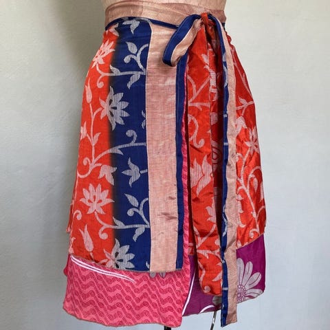 This is a stylish and eye-catching wrap skirt from the Italian brand Seventy. The design is modern and chic, featuring two distinct scarf-like prints that give it a unique, asymmetrical flair. It's a versatile piece that could be dressed up for an event or worn more casually. The drape of the fabric suggests a light, flowing material. It stands as size 42 but suits S.