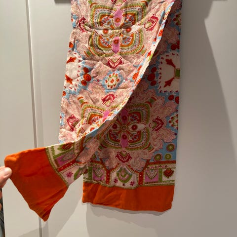 Selger et nydelig og unikt skjørt fra det italienske merket Seventy. Skjørtet har et iøynefallende "scarf-print" med geometriske mønstre i vakre farger som korall, grønt og sort.