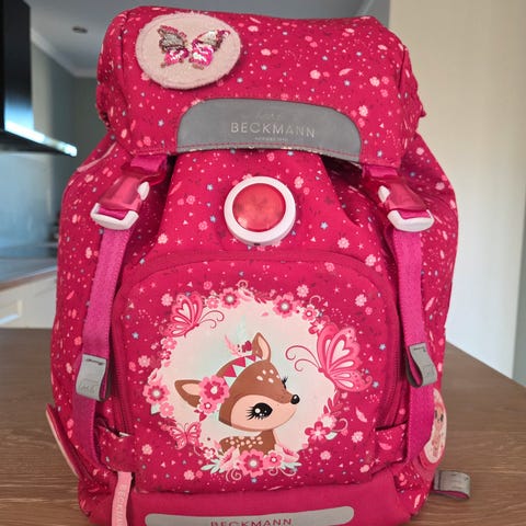 Eldste selger skolesekken sin da den har blitt for liten. Den passer til barn i første og andreklasse. Den er lilla med havfruemotiv. Alt av glidelåser og spenner følger med, i tillegg til merker man kan sette på sekken. Regntrekket er dessverre borte, og lyset foran trenger nytt batteri. Sekken er godt brukt, men det er mye bruk igjen!