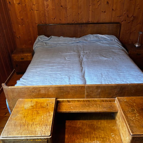 Gamle trebord og senger, både faste og skuvsenger