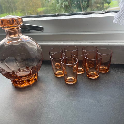 Vin dekanter / karaffel i lett bruntonet glass. Inngravert bokstavene FM i front. Høyde 16,7 cm, diameter nederst 10 cm, øverst 4,4 cm og 3 cm på det tynneste. Vekt: 278g. I hel og grei befatning. En dekanter er en beholder som brukes til å helle en væske (som vin) fra en beholder til en annen. Hovedformålet med dekantering er å skille væsken fra eventuelle sedimenter som kan ha dannet seg. Dette er spesielt vanlig i eldre viner. Dekantering brukes ofte i vinverdenen for å lufte og oksygenere vin.