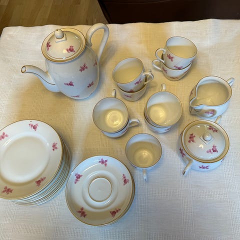 Selger et pent kaffeservise fra Prosgrund. Det er 4 asjetter, 3 tefat og 6 kopper. I tillegg er det en sukkerskål og en liten mugge.