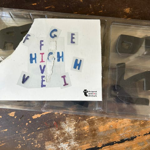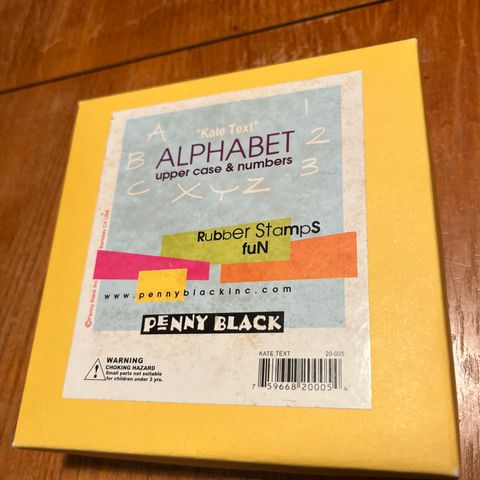 Trebokstaver med stempelpute. Brukt kanskje to ganger hvis ikke en. Bokstavene/alfabetet er av tre og er engelske så mangler ÆØÅ