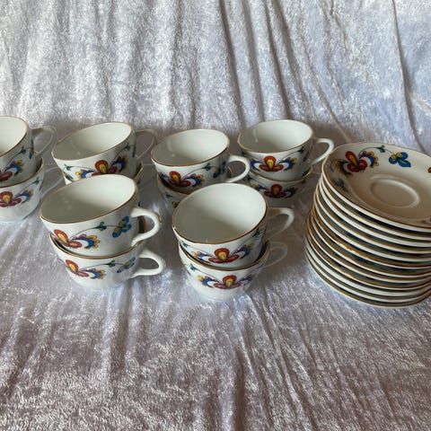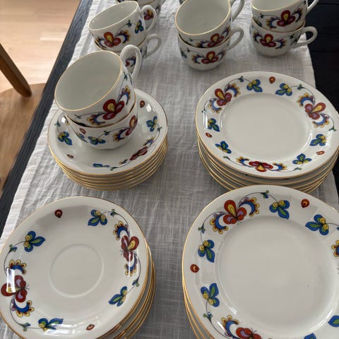 5 kuverter(kopp og skål) i mønsteret Bondemønster fra Porsgrund Porselen. Stått på hytta og bare vært vasket for hånd.