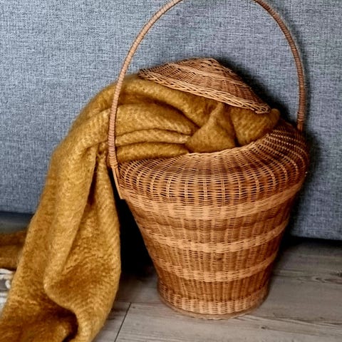 Nydelig vintage kurv med håndtak og lokk, 40cm + høy, med håndtak 50 cm. Veldig fin, selges grunnet plassmangel. Mange bruksmuligheter garn, blomster eller pynt 🧺🧶🪻🌷