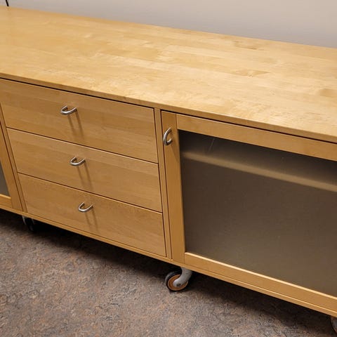 IKEA mediamøbel i treverk. Møbelet har to skuffer og en hylle med glassdør, perfekt for oppbevaring av mediautstyr. Det naturlige treverket gir et stilrent utseende som passer inn i de fleste hjem. Egnet for oppbevaring av elektronikk eller som en del av stueinnredningen.