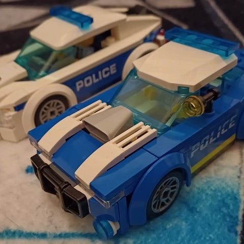 LEGO City lekesett med kjøretøy og figurer. Settet inkluderer en politibil, motorsykkel og rød sportsbil. Inneholder også politifigurer og tilbehør som sperringer og verktøy. Passer til å skape spennende byscenarier og lekesituasjoner.