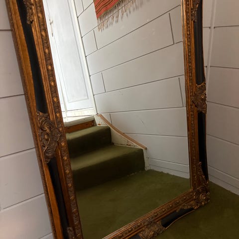 Vakkert vintage speile med ekstra stor og flott ramme i klassisk design. Bredde 120 cm, høyde 90cm. . Selve rammen har en bredde på 15 cm.. Speilen har slepent glass Bredde 90 cm og høyde 59 cm. Farge er en antikk nyanse i gull, så den passer godt inn i de fleste interiører.. Også til sølv.