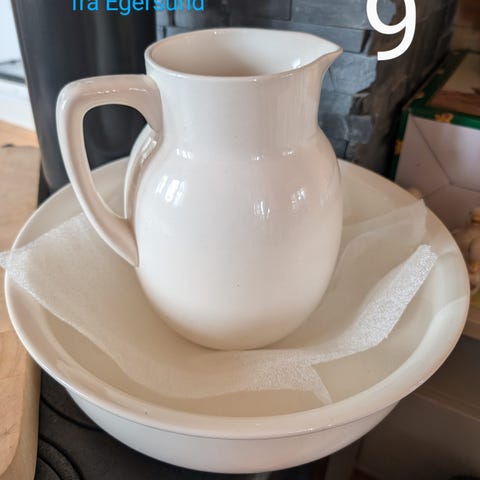 Nydelig og i flott stand, Vaskestell / vaskesett fra Egersund. Muggen er 30,5 cm høy, fatet er 38 cm i diameter, såpeskål 10x14 cm. Ingen krakelering verken inni eller utenpå noen av tingene, utsøkt. Alt har stempel under.