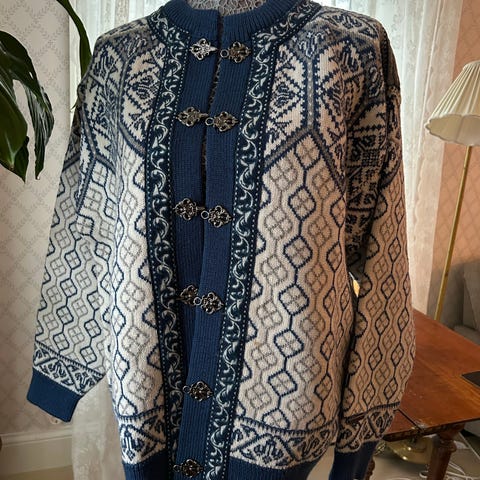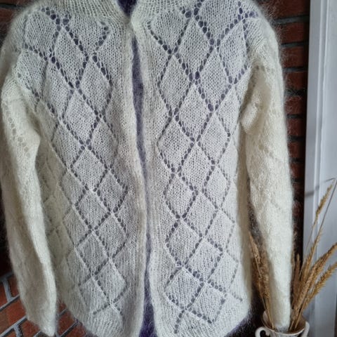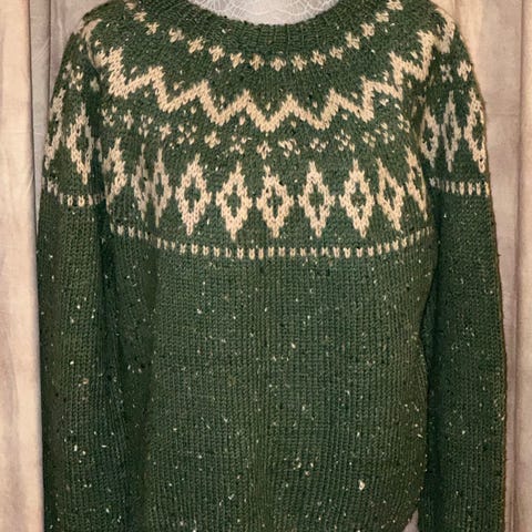 Selger ny hjemmestrikket genser strikket i Gann Garn (100% merinoull) Nydelig genser i lys beige i bunn og lys korall/lys gul i mønster. Overvidde 106 cm - hel lengde 66 cm - ermelengde 48 cm.