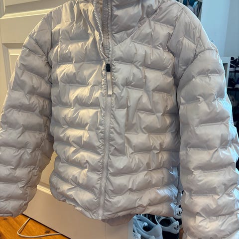Move Tech Sports Brand vinterjakke for kvinner i størrelse S. Jakken er grønn og designet for vinterbruk med isolasjon for varme. Den har hette og glidelåslommer foran. Materialet og detaljer er tilpasset for å gi beskyttelse mot kulde.