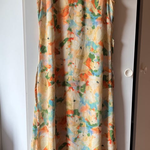 Stilig sommerkjole. Fint skimrende stoff laget av 50 % lin og 50 % bomull. Fin kremfarge. Den har lining, så den er ikke gjennomsiktig. Kjøpt i utlandet, brukt 2 ganger.