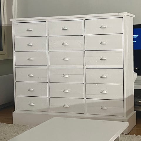 Dette er et flott oppbevaringsskap med god oppbevaringsløsning. Skuff øverst og nederst og hyller innvendig.