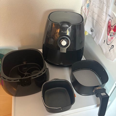 Cosori airfryer vil ha nytt hjem. Følger med et par rister, muffinsform, en kjele og et lite brett(?)